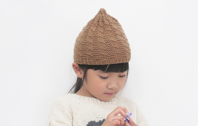 トップがつんっ、となったシルエットが可愛らしい帽子のキットです。ロシアにある玉ねぎのようなドーム型の建物をクーポルと呼ぶそうです。使用している糸 「ワッフル」は英国羊毛の入ったウール100%の紡毛糸で、とてもあたたか。