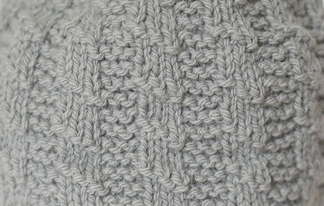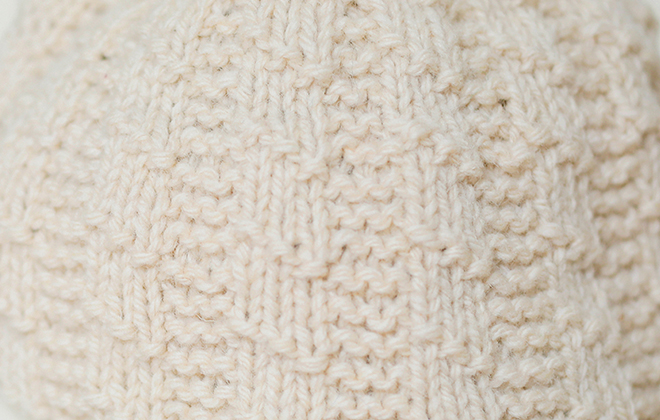 地模様は、表編みと裏編みを組み合わせて編んでいきます。斜めラインの入る柄になるのがポイント。「ワッフル」を使うことで、地模様が綺麗に出てくれます。