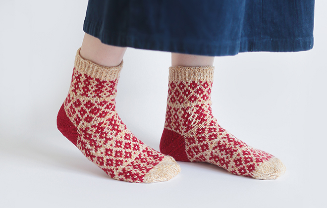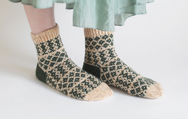 編み込み模様で編む靴下はしっかりとした編み地でとてもあたたかいですよ。左右、柄や色の組み合わせが違っていて、「編むことを楽しむ」、そんな工夫を取り入れました。つま先とかかとは同じ編み方で編むのもデザインのポイント。編んでから縮絨することでふわふわの肌触りになります。