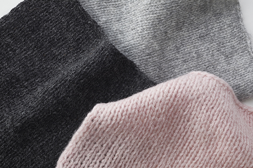 カシミヤとウールを混ぜ合わせた紡毛糸で、むちむちとしたふくらみと、かさ高さがあります。カシミヤ混のウール糸で肌触りがよく、とても暖かいですので、ウェアはもちろん、ショールやくつ下などの小物にもおすすめです。