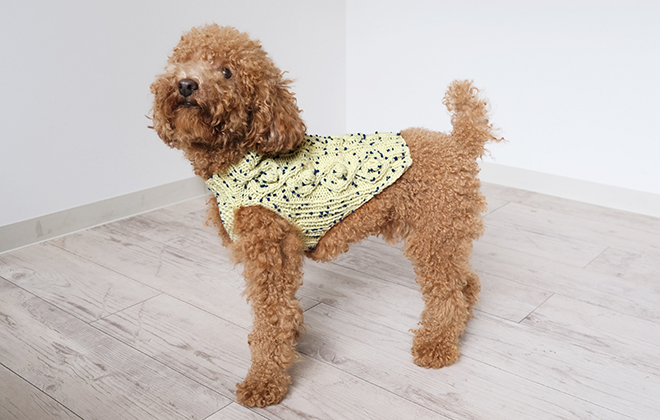 - ■SSサイズ:首回り28cm、胴回り36.5cm、着丈24cm ■Sサイズ:首回り28cm、胴回り39.5cm、着丈29.5cm