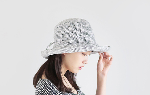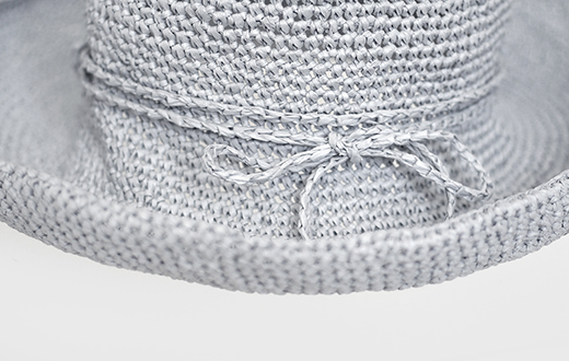 竹を原料とした、ラフィアのような質感の糸で編むつば付きハットです。